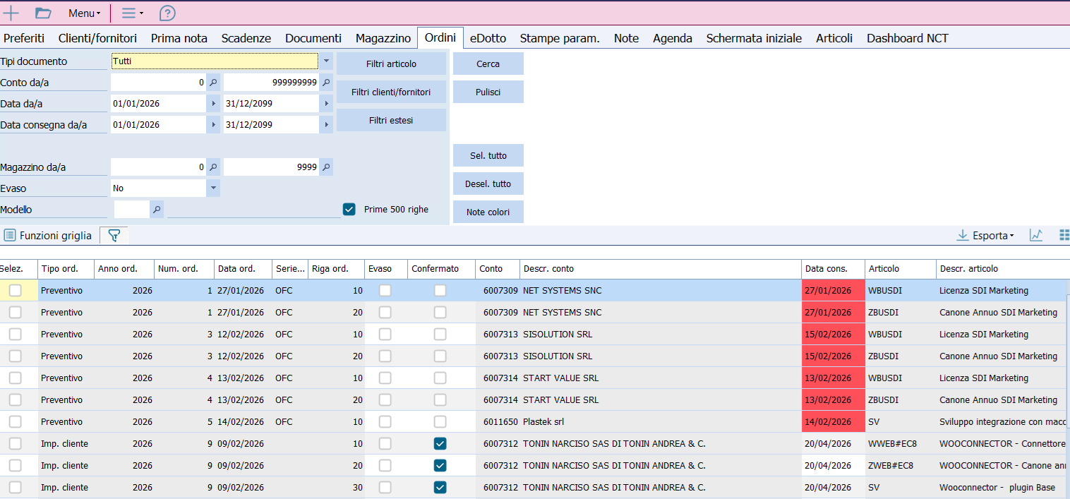 - Modifiche Massive: Selezionate più righe (es. cinque ordini diversi) e cambiate la data di consegna per tutti in un unico comando.
